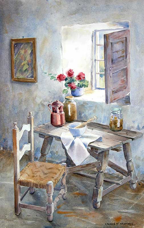 43- Acuarela. Mesa tocinera en la ventana. 56x32cm.